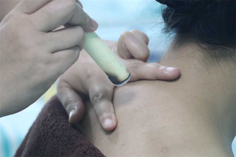 15、火龙罐技术 是集推拿、刮痧、艾灸、按摩、烫熨、点穴功能于一体,结合揉、碾、 推、按、点、摇、闪、震、熨、烫十种手法,兼以艾灸作用的新疗法。该技术完全避 免了刮痧及负压走罐的疼痛感,以及传统火罐造成血淤栓塞的负作用,即刮即化即消, 几乎无痛。改善风、寒、湿、瘀所致的各种病证,如颈椎病、腰椎病、强直性脊柱炎、软组 织损伤、胃肠功能低下、月经不调、痛经,以及骨折后水肿、糖尿病微循环障碍所致 的酸麻胀痛等。